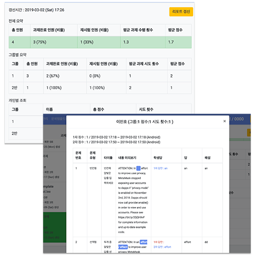 학생은 나의 과제 답안 및 해설을 앱에서 확인 할 수 있으며, 선생님은 웹사이트에서 학생의 과제 진행 여부 및 학생별 점수 리포트를 확인하여 학생 별 맞춤 피드백이 가능합니다.